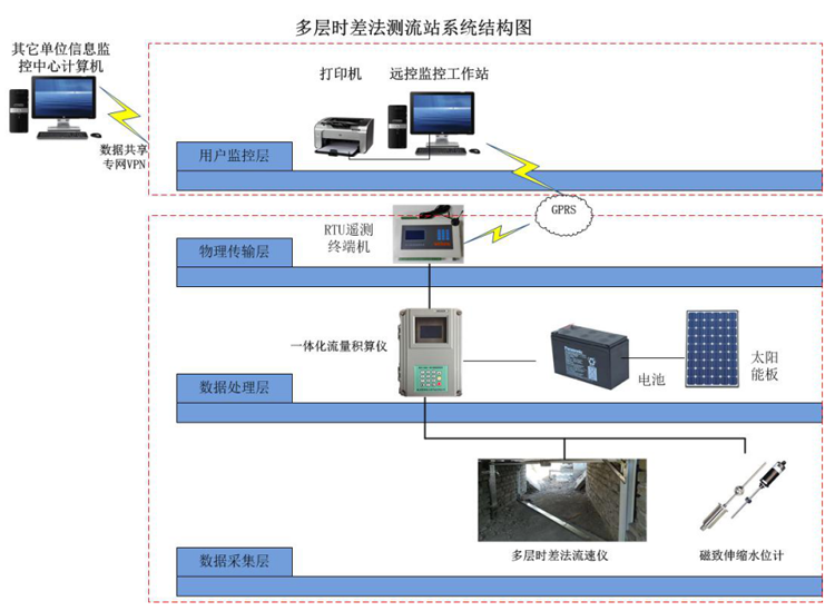 本測流設(shè)備主要有多層時差法流速儀、高精度水位計(磁致伸縮或磁編碼器浮子式等)一體化積算儀、傳輸模塊和供電單元組成。我司通過對國內(nèi)外諸多廠家的明渠測流設(shè)備功能與特點的統(tǒng)計與分析,總結(jié)出普遍存在諸多問題后(如:渠道結(jié)構(gòu)多樣性、水質(zhì)較差,漂浮物較多、淤泥沉淀和阻水等情況),為了能解決傳統(tǒng)產(chǎn)品的局限性,針對性的設(shè)計與研發(fā)了本測流系統(tǒng),經(jīng)過在諸多項目中的實際應(yīng)用,取得了極佳的應(yīng)用效果。